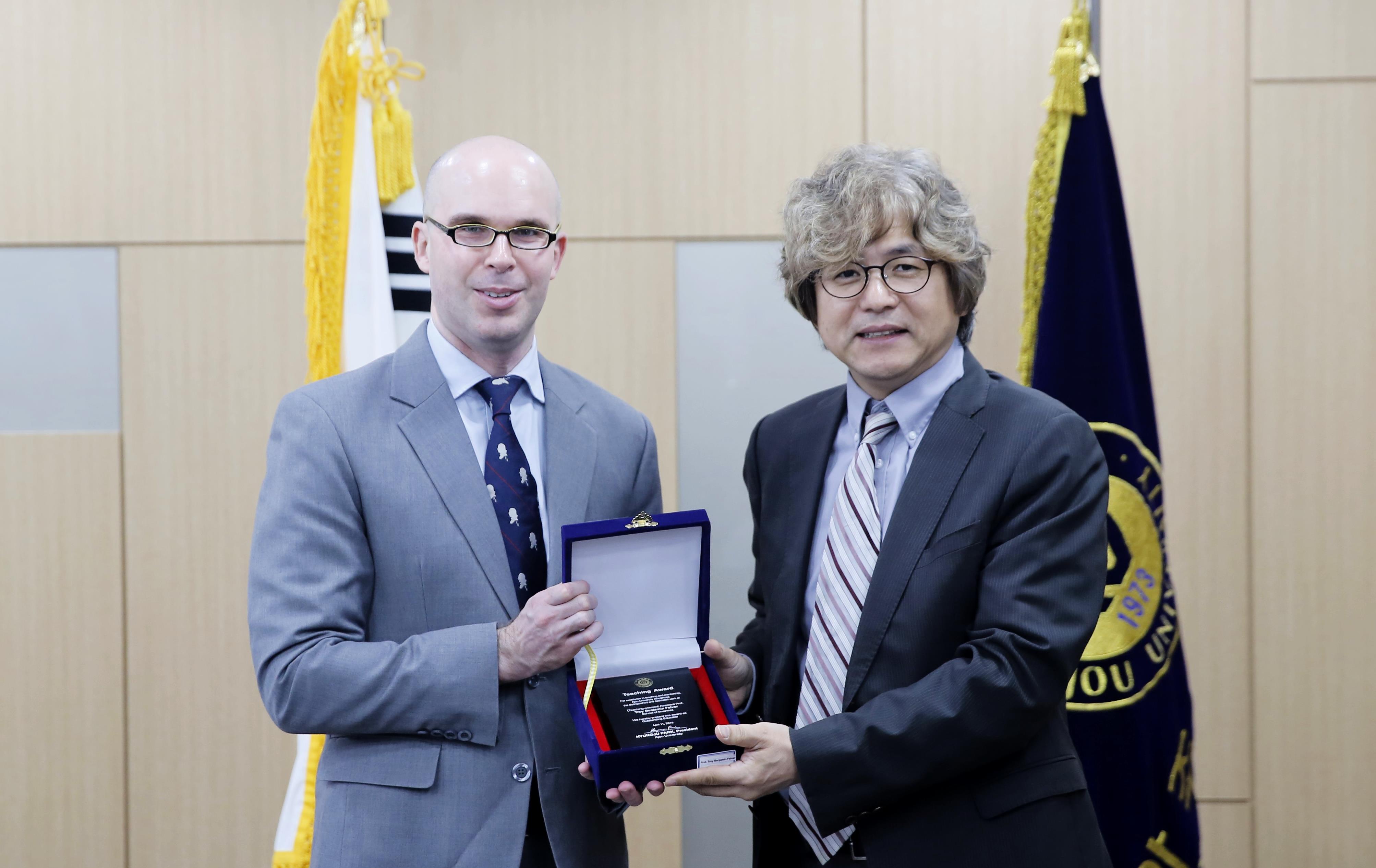 ‘2017학년도 교육 우수 교수 시상식(Teaching Award)’이 지난 4월 11일 율곡관 총장실에서 열렸다. 경영학과 Troy Benjamin Felver 교수를 비롯해 학생 교육에 힘써온 6명의 교수가 수상의 영광을 안았다.‘교육 우수 교수’는 각 단과대학의 추천을 받아 학사운영 및 교육과정위원회의 심사를 통해 확정된다. 위원회 심사에서는 교육발전에 대한 기여도와 교육방법의 혁신성, 교육에 대한 열정을 기준으로 수상자를 선정한다. ‘2017학년도 교육 우수 교수’ 대상은 Troy Benjamin Felver 교수(경영학과, 위 사진 왼쪽)가 수상했다. Benjamin 교수는 노력과 열정을 바탕으로 학생들을 지도한 점을 인정받아 대상의 영예를 안았다.와 , , 등 다양한 과목을 강의해 온 그는 학생들이 주도적으로 수업에 참여하고 학습할 수 있도록 여러 교수법을 도입해 활용해왔다. 토론에 참여하는데 어려움을 겪는 학생들에게는 ‘질문자’ 역할을 부여, 자연스럽게 토론에 참여하며 경쟁력을 갖추도록 했고 최신 이론과 이슈를 소개하기 위해 인터뷰와 언론 자료, 학술 자료 등을 적극 발굴해왔다. 이에 흥미가 유발되고 학업 성취도가 높아졌다는 학생들의 피드백이 많았다. Benjamin 교수는 또한 학기 중반 학생들에게 수업 내용에 대한 평가와 제안 사항 등을 받아 이를 적극 반영해왔다.우수상은 ▲곽진 교수(사이버보안학과) ▲백호기 강의교수(국방디지털융합학과) ▲안성혁 교수(물리학과) ▲박재연 교수(국어국문학과) ▲김성환 교수(경제학과)가 받았다.박형주 총장이 수상자들에게 직접 상장을 전달하고 격려했다. 오영태 산학부총장과 장우진 교무처장을 비롯한 보직 교수들도 함께 자리해 축하했다.